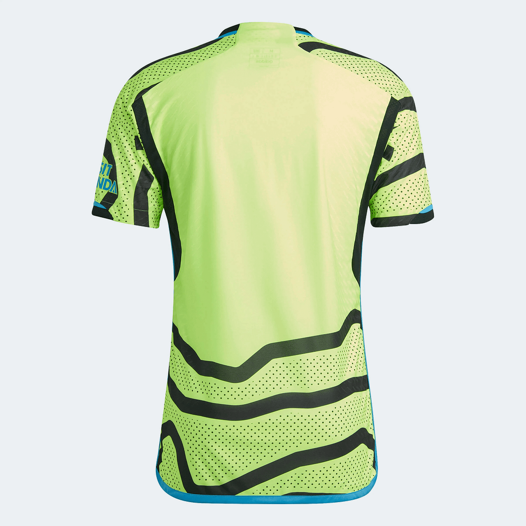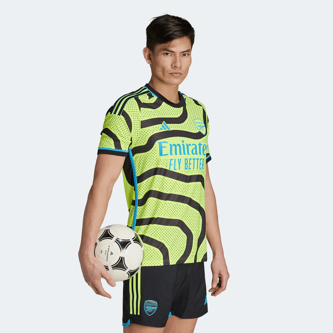 Inspired by the passion of travelling supporters, the Arsenal 23/24 Away Authentic Jersey is loosely inspired by a map of the teams’ borough, with a fluid line design reflecting the flow in and out of N7 when Arsenal fans are on the march. A fresh, shock-yellow color completes the update, alongside light blue accents. The iconic, lightweight crest — maximizing airflow so you can feel cool — help to ensure the top stays pro-player ready.