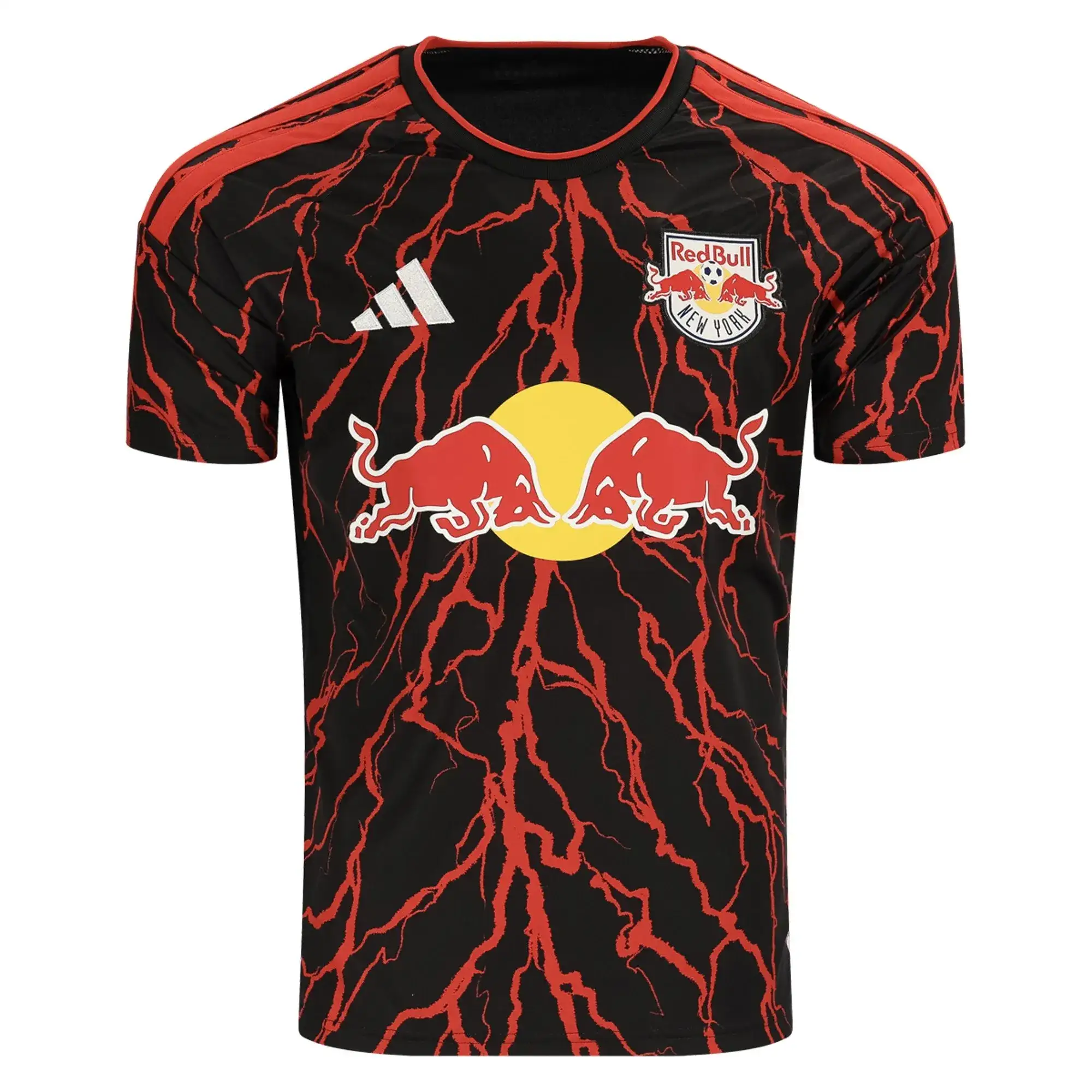 Victory Stripes: Traditional Adidas stripes stand out in red against the black sleeves.