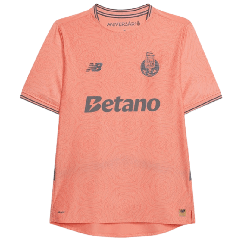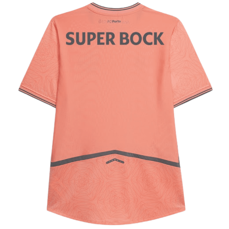 🌸 Design & Inspiration This season’s down tackle features a soft salmon pink base, emblematizing the camellia flower, which has adorned Porto’s auditoriums since the 19th century. A tonal flowery graphic subtly embellishes the fabric, paying homage to the megacity’s flowery heritage. The jersey’s clean lines and minimalist aesthetic offer a ultramodern twist on classic design.