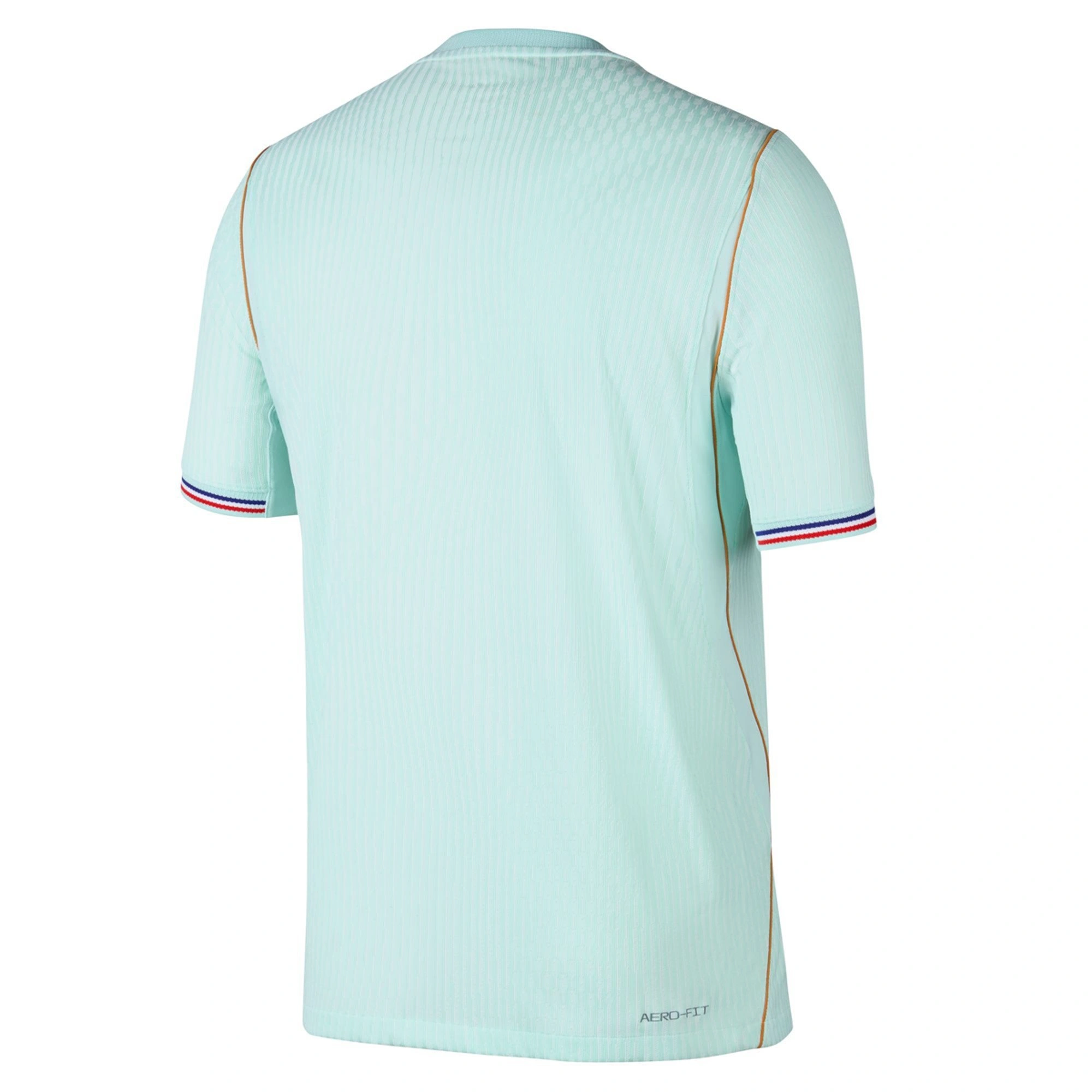 Celebrate a historic international bond with the France 2026/27 Authentic Away Jersey from Nike today. This elite jersey pays tribute to the Statue of Liberty with a cool ‘Igloo’ mint green color scheme. Nike’s design team chose copper ‘Monarch’ hues for the crest and Swoosh logo. These colors evoke the original metal exterior of the famous landmark. White horizontal pinstripes on the jersey evoke a sense of old-world French sophistication. With this jersey, you get a high-performance silhouette for high-stakes matches in North America.