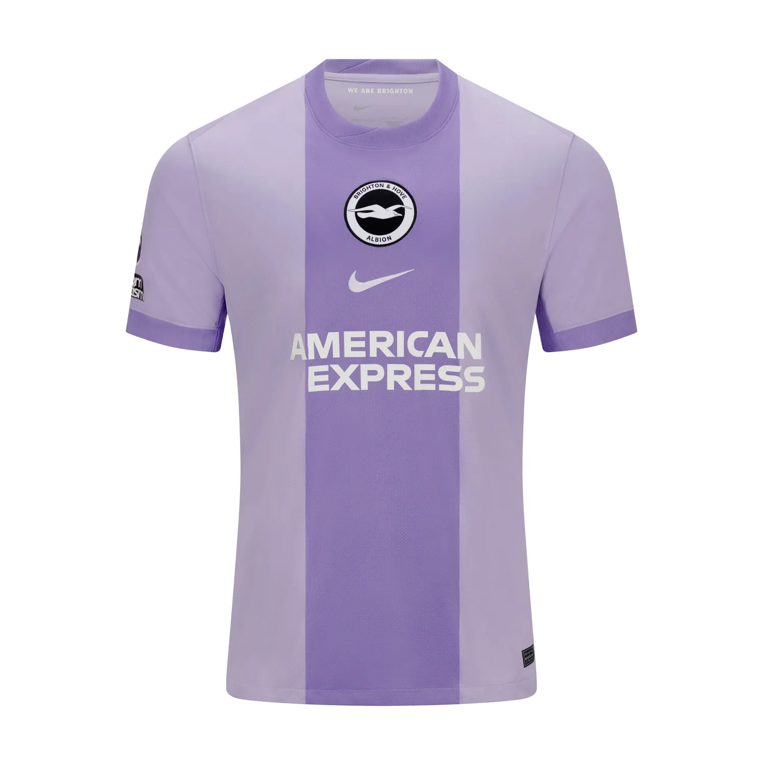 Show your support in style with the Georginio Rutter edition of Brighton’s 2025/26 away jersey, designed by Nike. This suit features a dual-tone purple palette, with a dark middle stripe and lighter purple sleeves and sides. For the first time in the Nike era, the BHAFC crest and Nike Swoosh are centered on the chest. Nike’s Dri-FIT technology, made from recycled polyester, provides lightweight and breathable comfort for both fans and players. You’ll be able to personalize it with “RUTTER” and his team number (if confirmed), depending on printing availability and league standards.