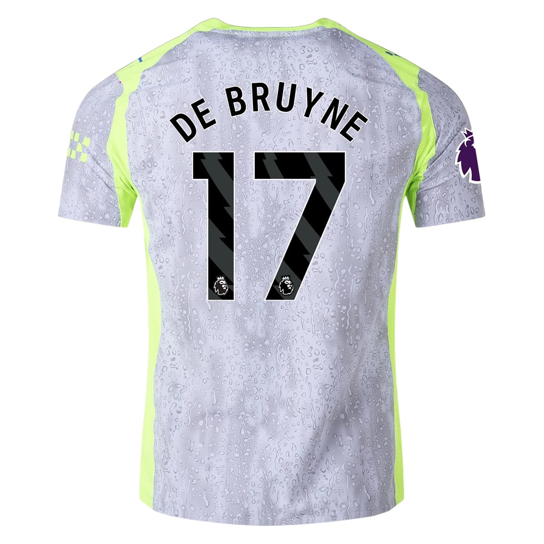 The back features DE BRUYNE 17 in official Premier League font. Heat-applied name, number, crest, and sponsor logos reduce weight and enhance breathability. This is the same jersey the players wear—engineered for elite performance, not just looks.