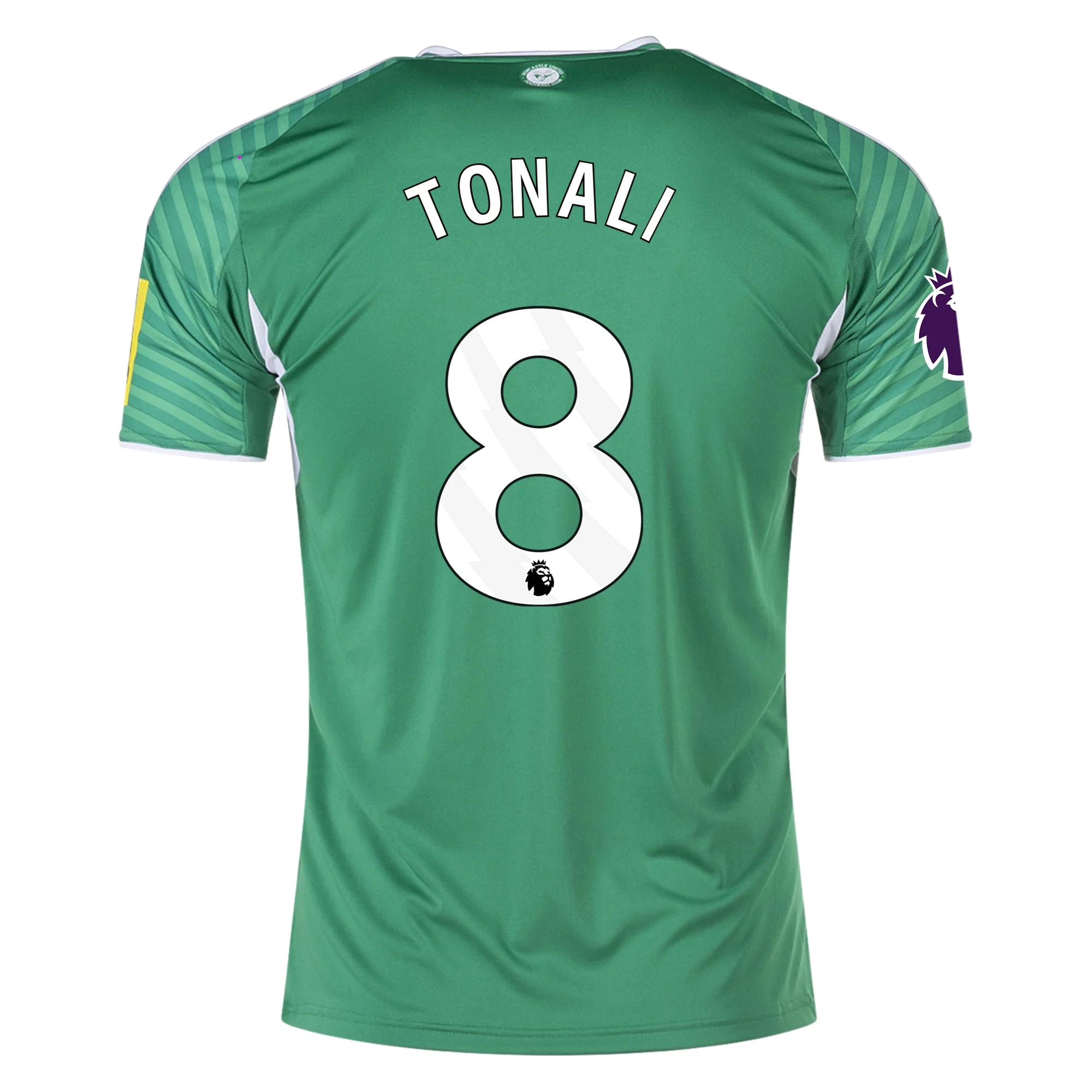 The club crest, sponsor logos, and Adidas emblem are all in white for maximum contrast. NUFC appears beneath the back neckline. The outfit features white shorts with green Adidas three-stripes and green socks with the Magpie insignia. This version features Tonali #8 on the back. It’s ideal for supporters who desire his name, team pride, and a unique away design. Made of 100% recycled polyester.