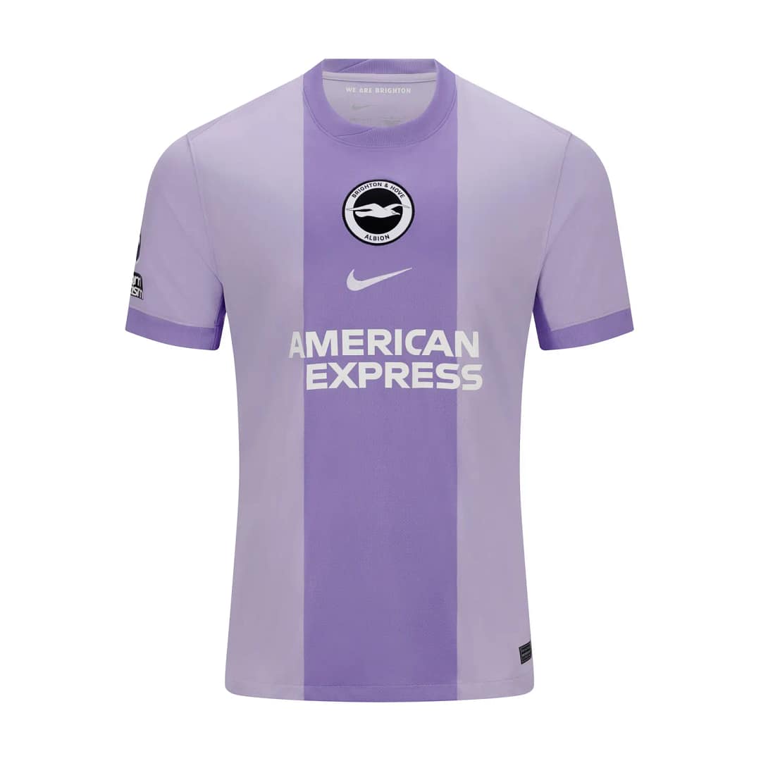 Show your support with the Stefanos Tzimas edition of Brighton’s 2025/26 away jersey from Nike. The design features a dual-tone purple color pattern, with a prominent central stripe and milder tones on the sleeves and sides. For the first time under Nike, the club crest and the Swoosh are centered on the breast. Nike’s Dri-FIT technology provides breathability, lightness, and comfort, while recycled polyester fibers are used in its construction.
